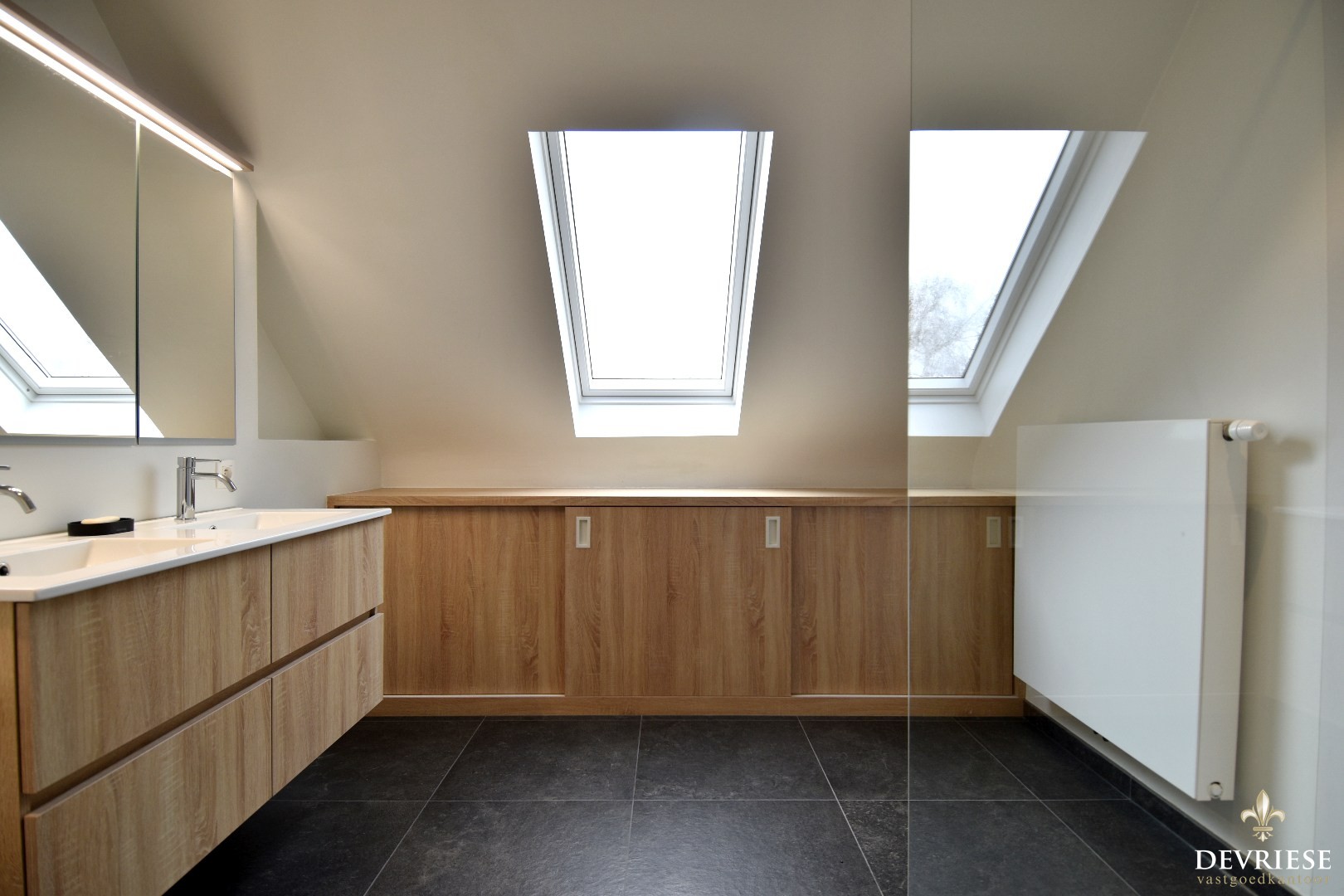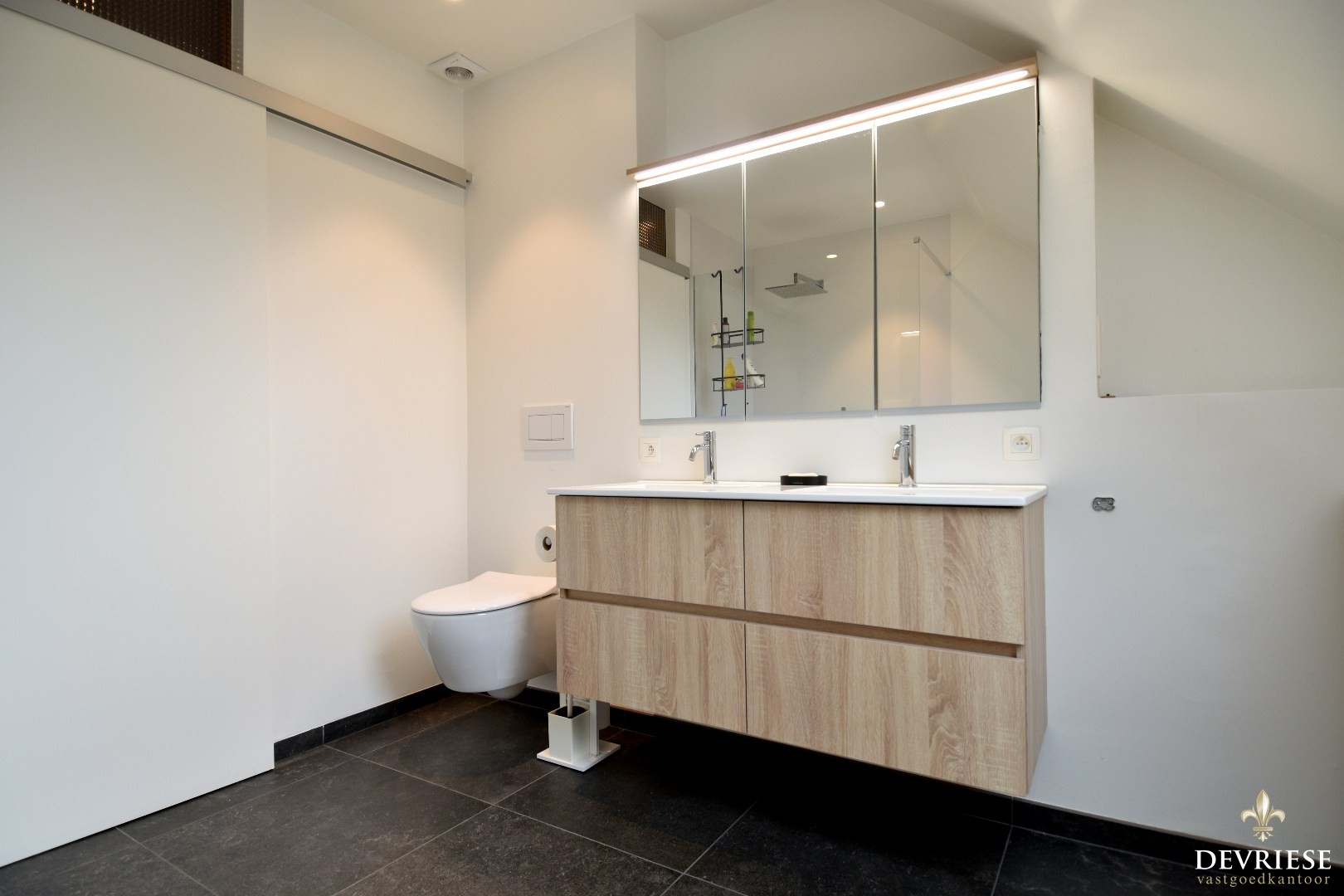 De recent vernieuwde badkamer is ... uitgerust met een tweede toilet, een dubbel lavabomeubel en een ruime inloopdouche.