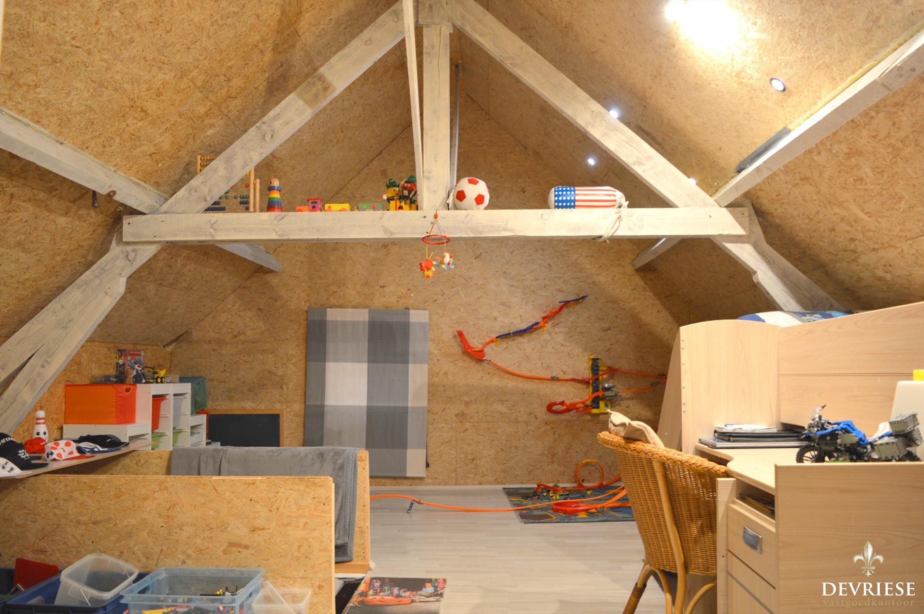 De bovenverdieping is geïsoleerd en ingericht. Op vandaag één ruimte die gebruikt wordt als kamer - speelruimte - dressing - bureau. Hier kunnen gemakkelijk 2 ruime slaapkamers worden ingericht.
