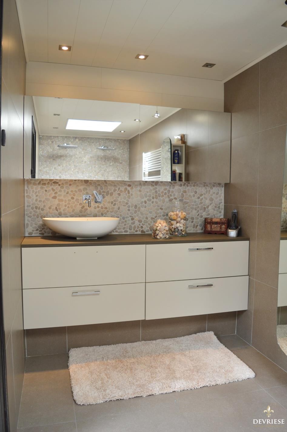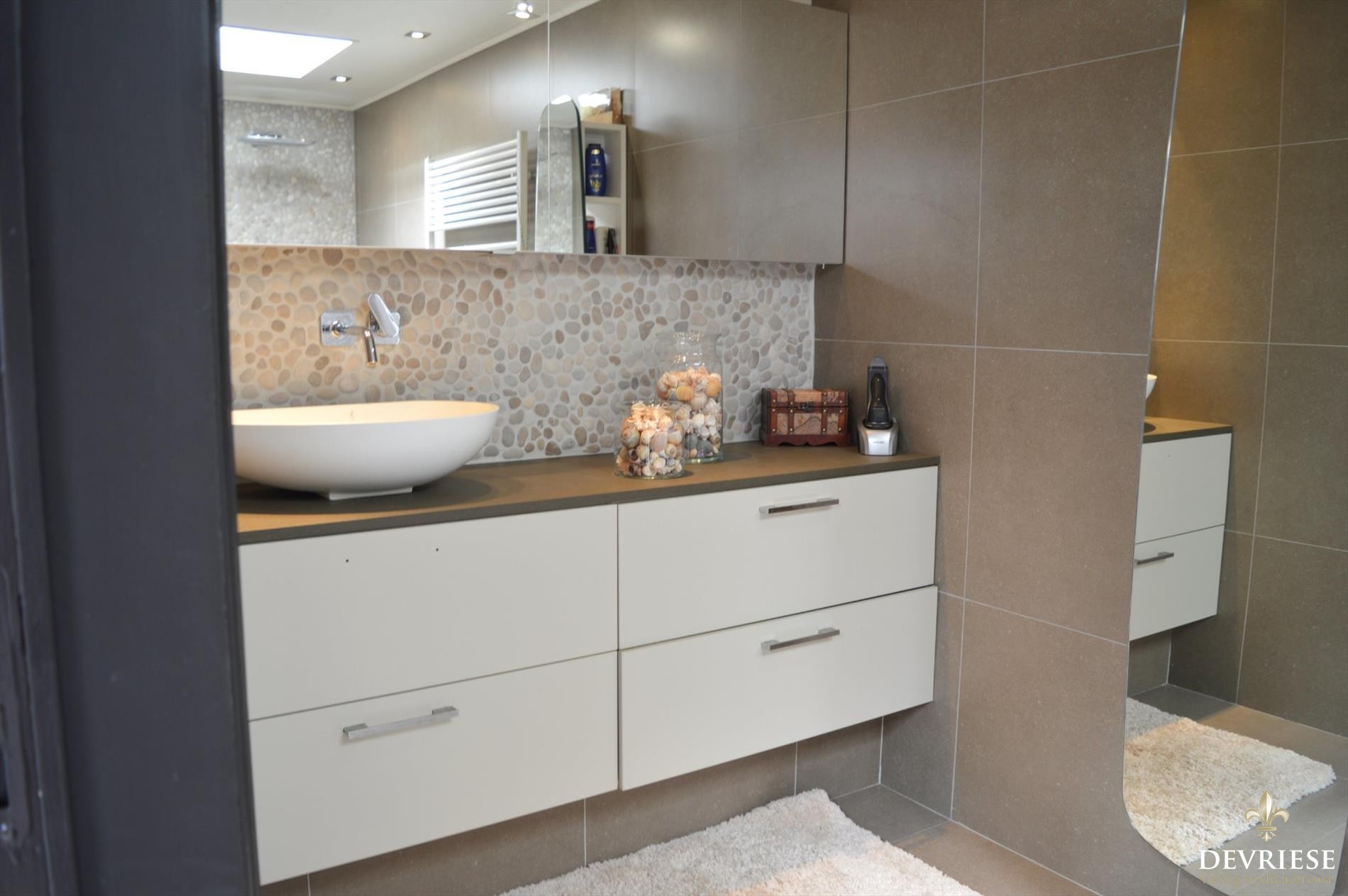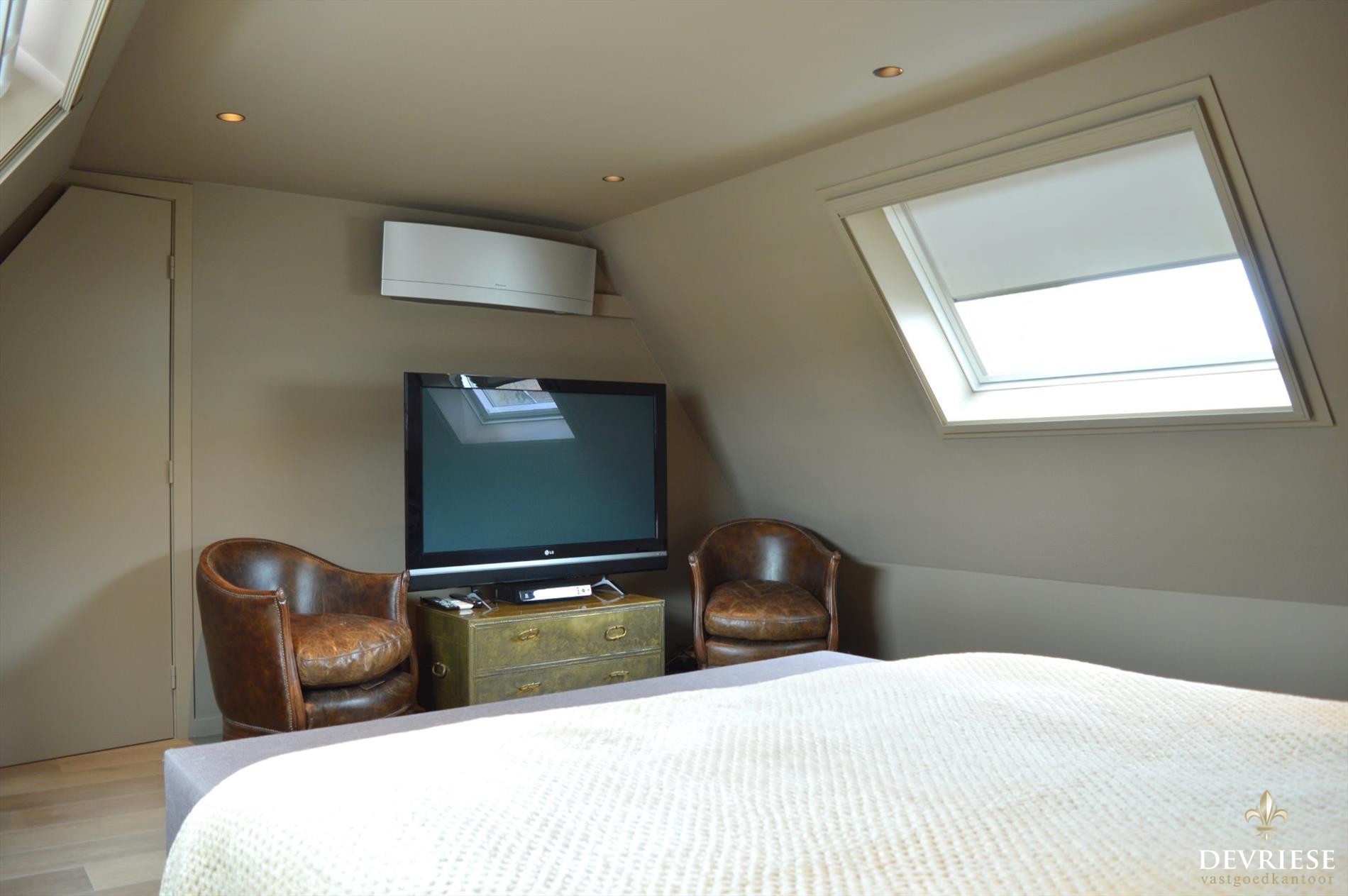 Grote inloopdouche, dubbele wastafel en een moderne afwerking. Op de eerste verdieping zijn er 2 volwaardige slaapkamers en een derde kamer die op vandaag werd ingericht als dressingruimte. Deze kan vanzelfsprekend opnieuw omgevormd worden tot derde slaapkamer.