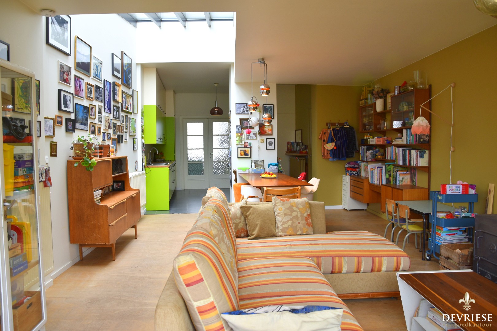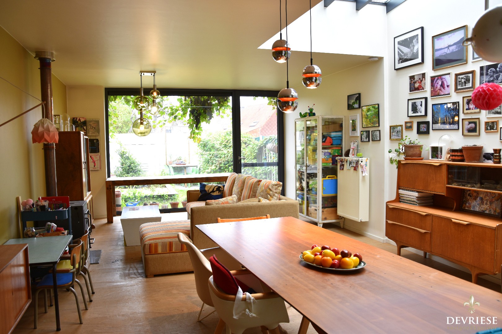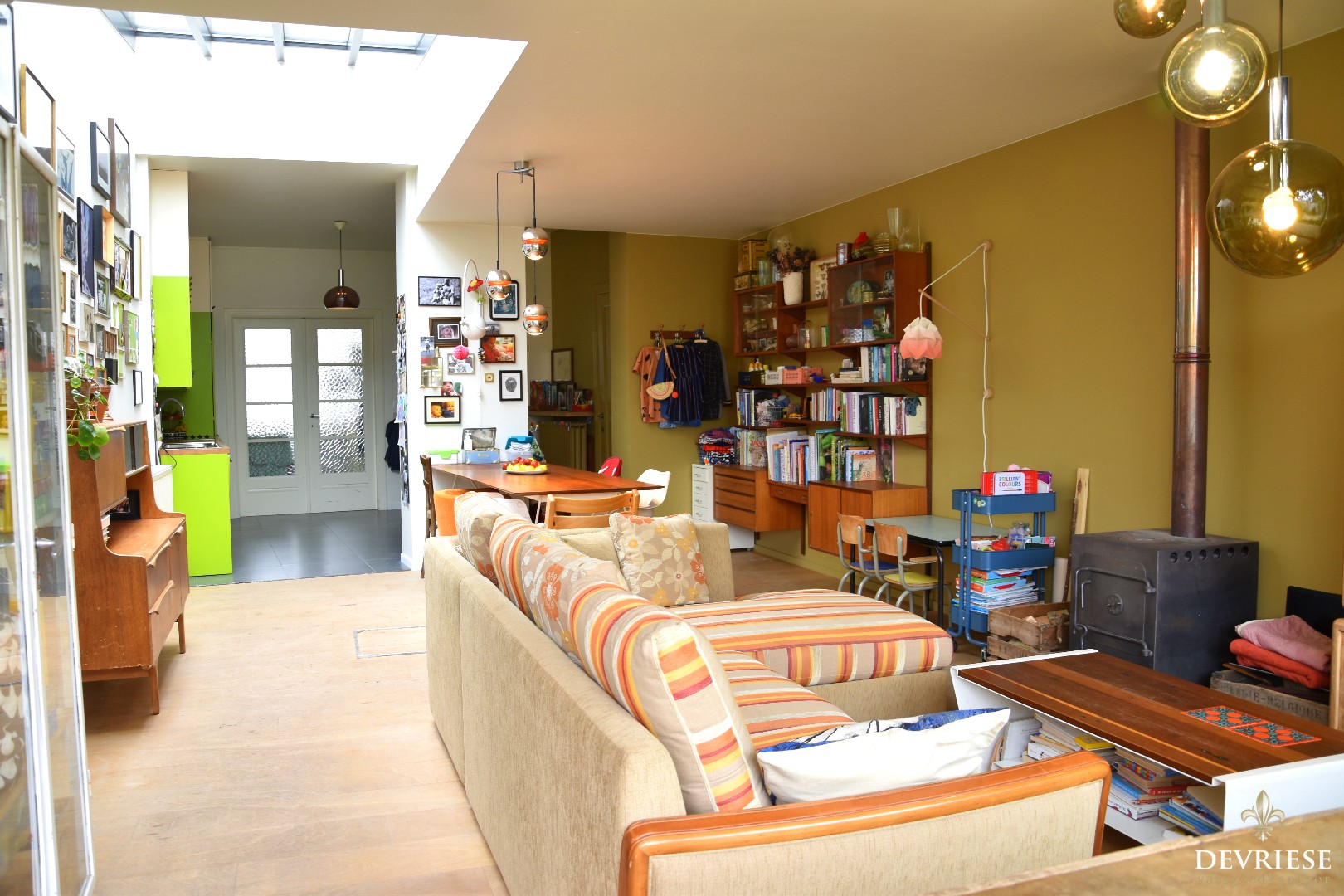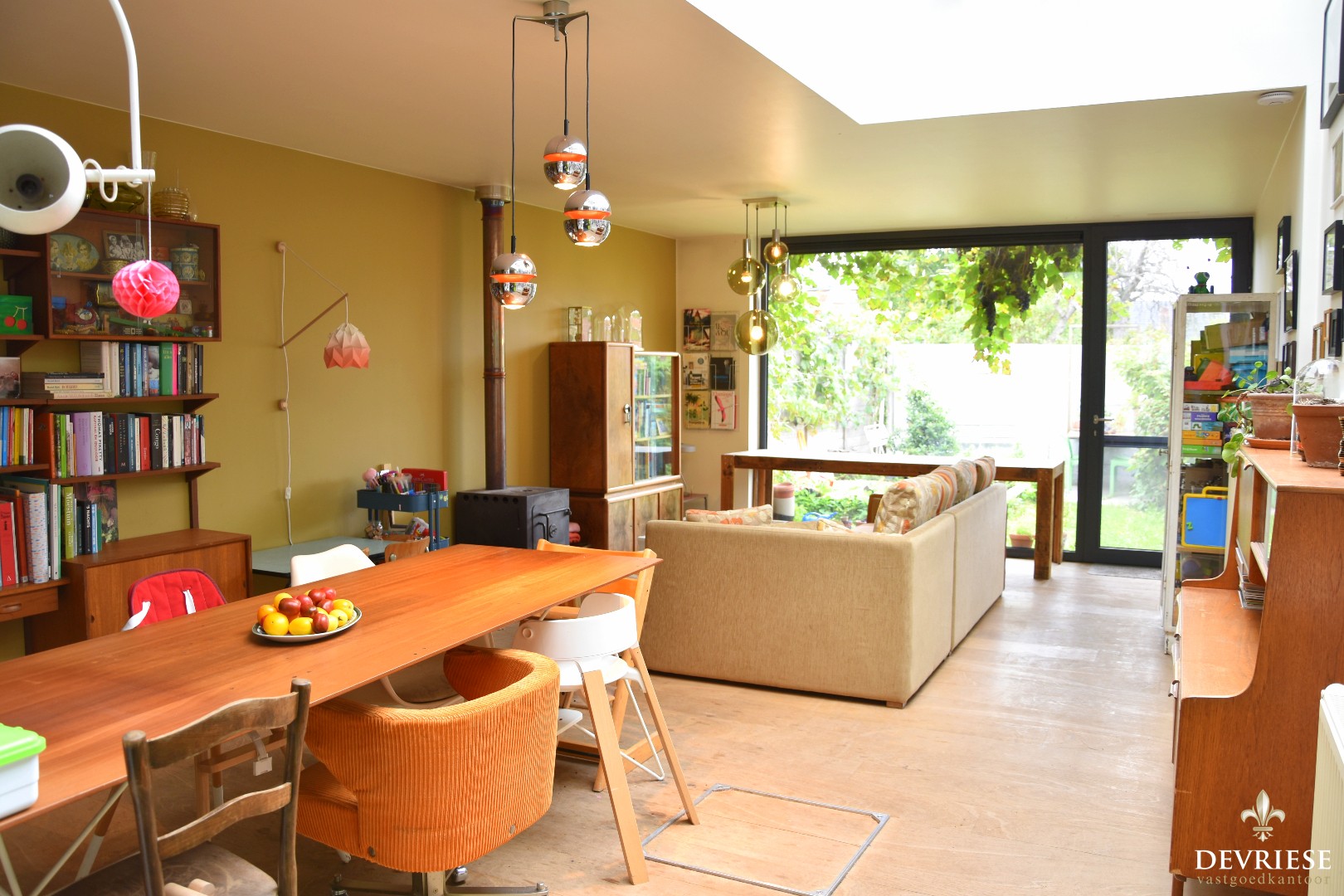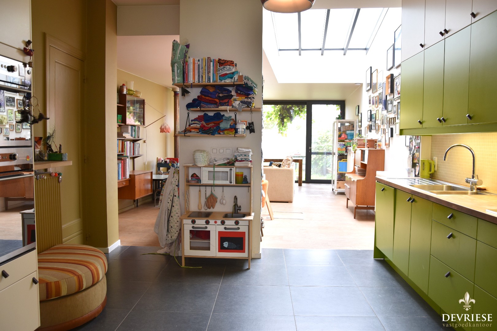 Via de aparte inkomhal met gastentoilet treden we de langgerekte leefruimte binnen. De ruime open keuken gaat over in de woonkamer die veel daglicht geniet dankzij een slim geplaatste lichtstraat. Van hieruit geniet u vol zicht op de achtertuin.