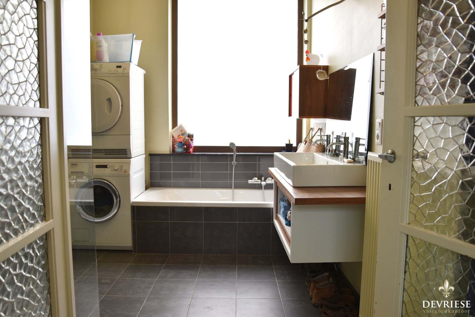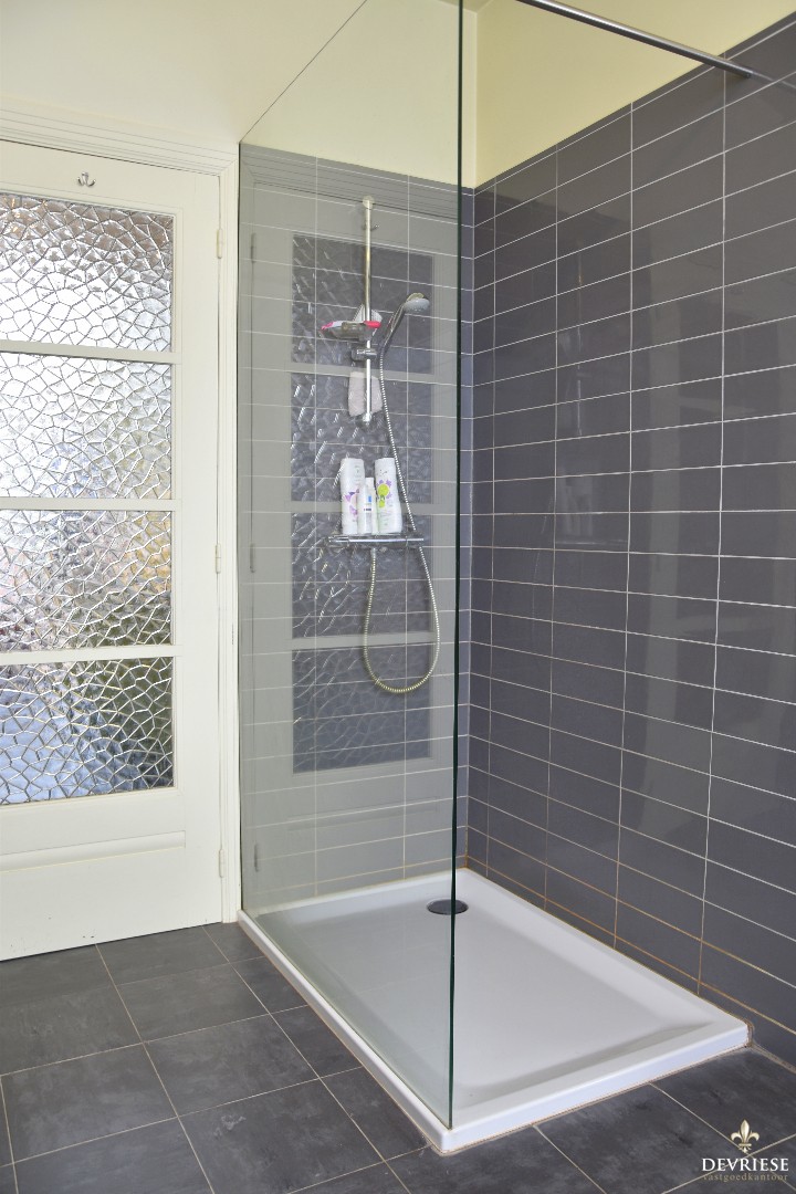 Verder op het gelijkvloers vinden we vooraan de badkamer met ligbad, douche en dubbele lavabo.